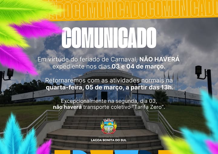 Em virtude do feriado de Carnaval, não haverá expediente nos dias 03 e 04 de março. As atividades retornarão na quarta-feira, 05 de março, a partir das 13h.